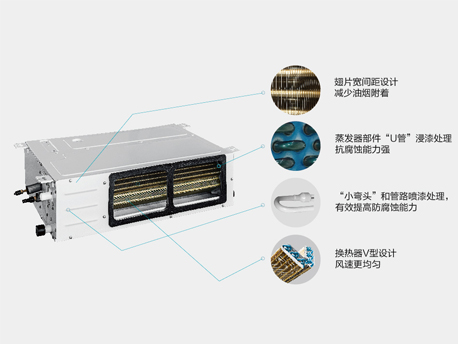 廚享內(nèi)機(jī)采用金色防腐翅片換熱器,抗腐蝕能力強(qiáng),翅片采用寬間距設(shè)計(jì),可減少油煙附 著:換熱器采用V型設(shè)計(jì),使風(fēng)速更均勻。